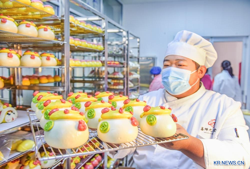 3일 산동교주(膠州)시에 위치한 흑씨(黑氏) 전통 화모(花饃·찐빵에 여러 가지 인물이나 동물의 형상을 빚어 장식하는 중국의 전통 민속 공예) 무형문화유산 공방에서 점주가 제품을 꺼내고 있다.