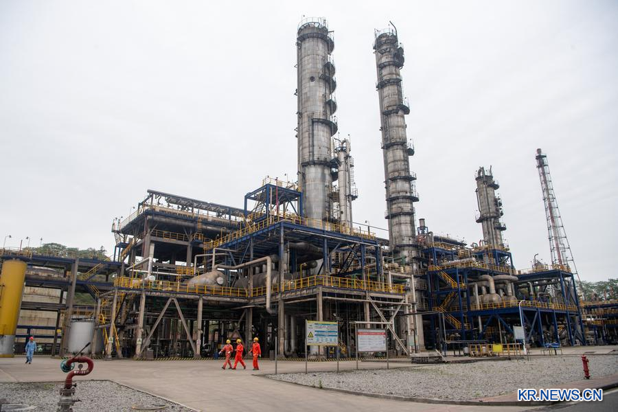 지난 2025년 4월 22일 중국 시노펙그룹 중경(重庆) 천유(川维)화학공업회사 직원이 공장 구역을 둘러보고 있다. /신화통신