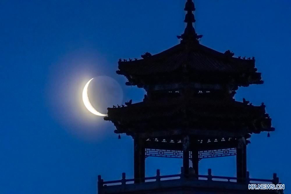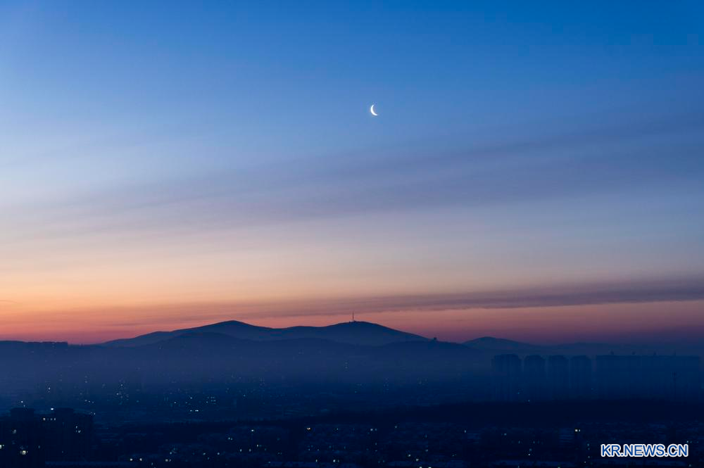 15일 흑룡강(黑龍江)성 치치할(齊齊哈爾)시에서 포착한 그믐달. 이날 새벽 하늘에 올해 가장 작은 그믐달이 떠올랐다. 이는 달의 위상이 그믐달일 때 원지점을 지나면서 달의 시직경이 작아져 나타나는 현상이다.