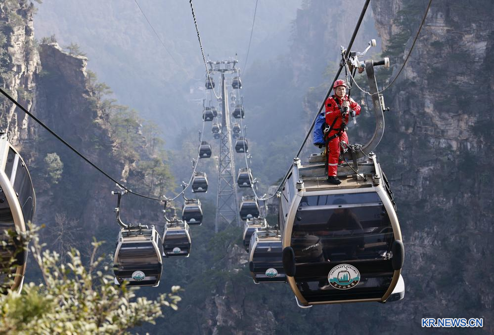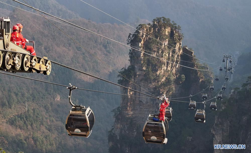15일 호남(湖南)성 장가계(張家界)국가삼림공원이 천자산(天子山) 케이블카에서 동계 고공 구조 훈련을 실시했다. 케이블카의 안전 성능과 관광지 각 부문의 신속한 림기응변 능력을 점검함으로써 관광객의 안전을 보장하자는 취지다.