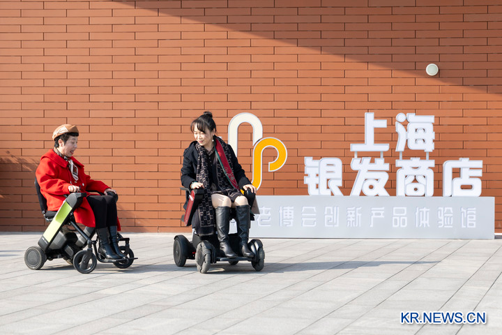 지난 15일 상해 실버스토어 매장에서 전동휠체어를 체험하고 있는 고객. (사진/신화통신)