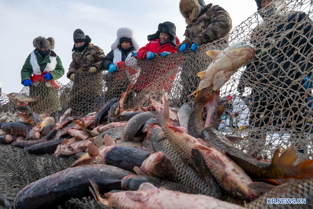 17일 어부들이 '2026 흥개호 겨울 고기잡이 축제' 현장에서 그물을 얼음 우로 끌어올리고 있다.
