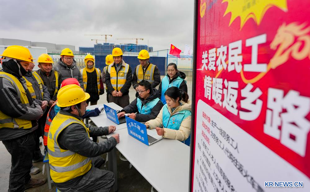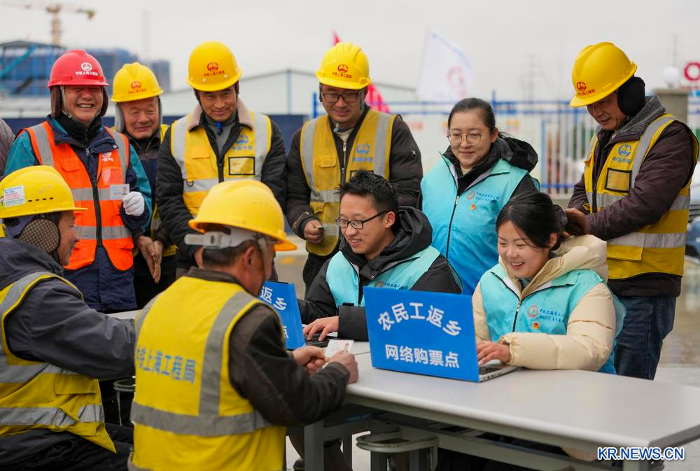 19일 음력설 특별수송기간(春運) 첫날 기차표 판매가 시작되자 중철(中鐵) 상해공정국의 청년 자원봉사자들이 농민공의 귀향을 위한 기차표 예매 지원에 나섰다. 이날 합비(合肥)시 신안휘(新安徽) 가통(佳通)공업단지 프로젝트 공사 현장에서 청년 자원봉사자들이 농민공의 기차표 예약을 돕고 있다.