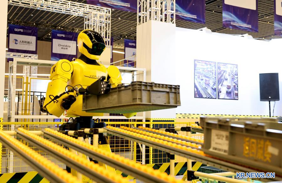 2025년 12월 12일 '2025 글로벌 개발자 콘퍼런스 및 국제 체화지능 기능 대회(GDPS 2025)'에서 화물 운반 경기에 나선 로봇. (사진/신화통신)
