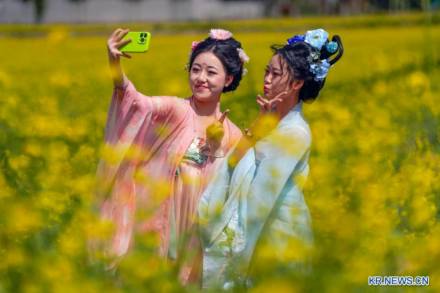 2025년 5월 4일 한복(汉服)를 입은 관광객이 하북(河北)성 준화(遵化)시의 한 꽃밭에서 사진을 찍고 있다. (사진/신화통신)