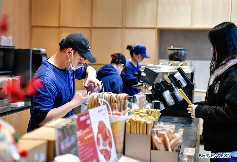 2025년 12월 23일 귀주성 귀양시 운암(云岩)구에 위치한 음료 매장인 '거차산(去茶山)'의 직원이 차 음료를 포장하고 있다. (사진/신화통신)