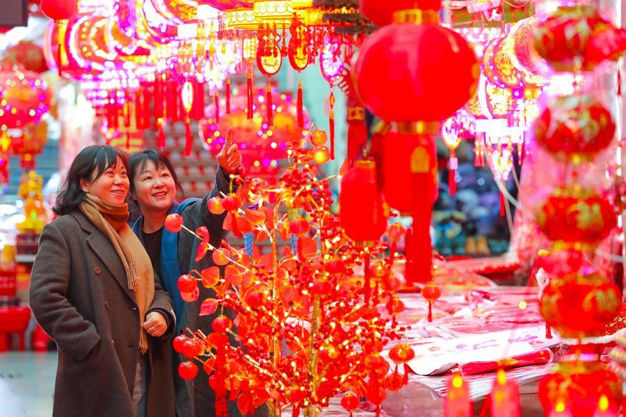 지난 3일 강소성 해안(海安)시 태녕(泰宁) 시장에서 음력설 장식품을 고르고 있는 주민들. (사진/신화통신)