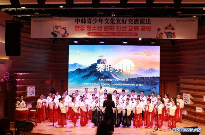 중·한 청소년 문화친선교류 공연에서 북경대 부속소학교 어린이합창단이 '진시명월(秦時明月)' 공연을 선보이고 있다.