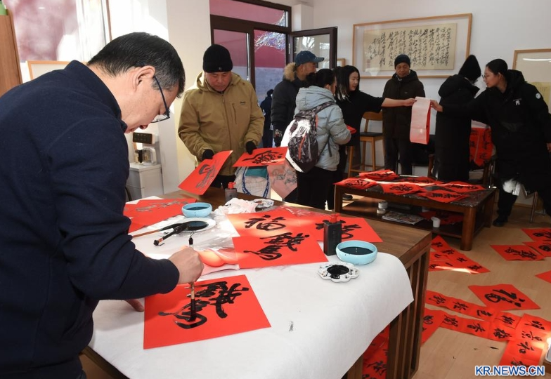 이날 서예가가 원명원 해당(海棠) 서원에서 방문객들에게 '복(福)'자와 춘련(春聯·음력설 대문이나 기둥에 붙이는 글귀)을 써서 선물하고 있다.