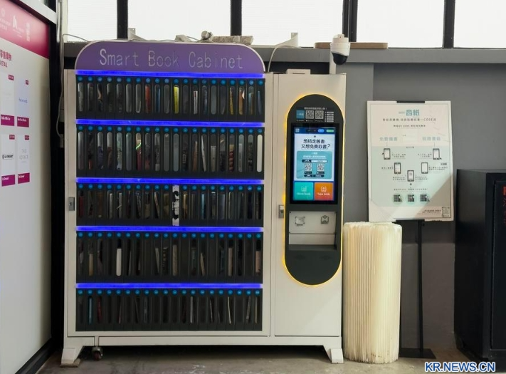 회기업 '이다즈(一沓紙)'의 창업자인 장선행(張善行)이 지난 1월 15일 자원봉사자와 함께 스마트 북 크로싱 머신의 서적을 정리하고 있다.
