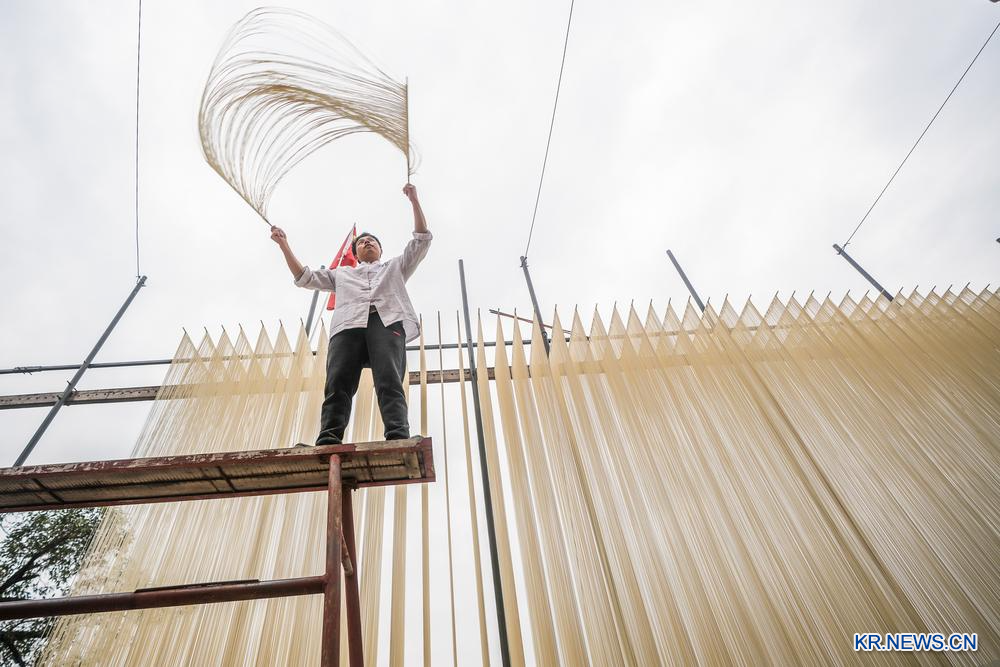 각혜촌 주민들이 맑은 날을 틈타 수제 괘면(挂面·밀가루에 소금 등을 넣어 반죽한 면을 걸어서 건조해 만든 건면)을 만들고 있다. 각혜촌에서 생산된 수제 괘면 제품은 국내 29개 성과 말레이시아, 싱가포르 등 10여 개 국가(지역)로 수출되고 있다.