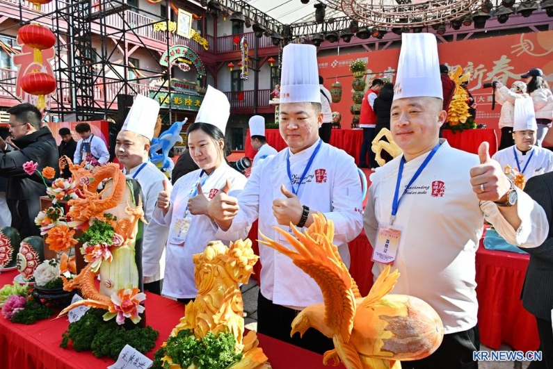 25일 '2026년 청도 무 조각 대회'가 산동성 청도시 시북구에서 열렸다. 현지 외식업계에서 온 30여 명의 식재료 조각 기술자들은 한데 모여 예술적 기예를 뽐냈다.