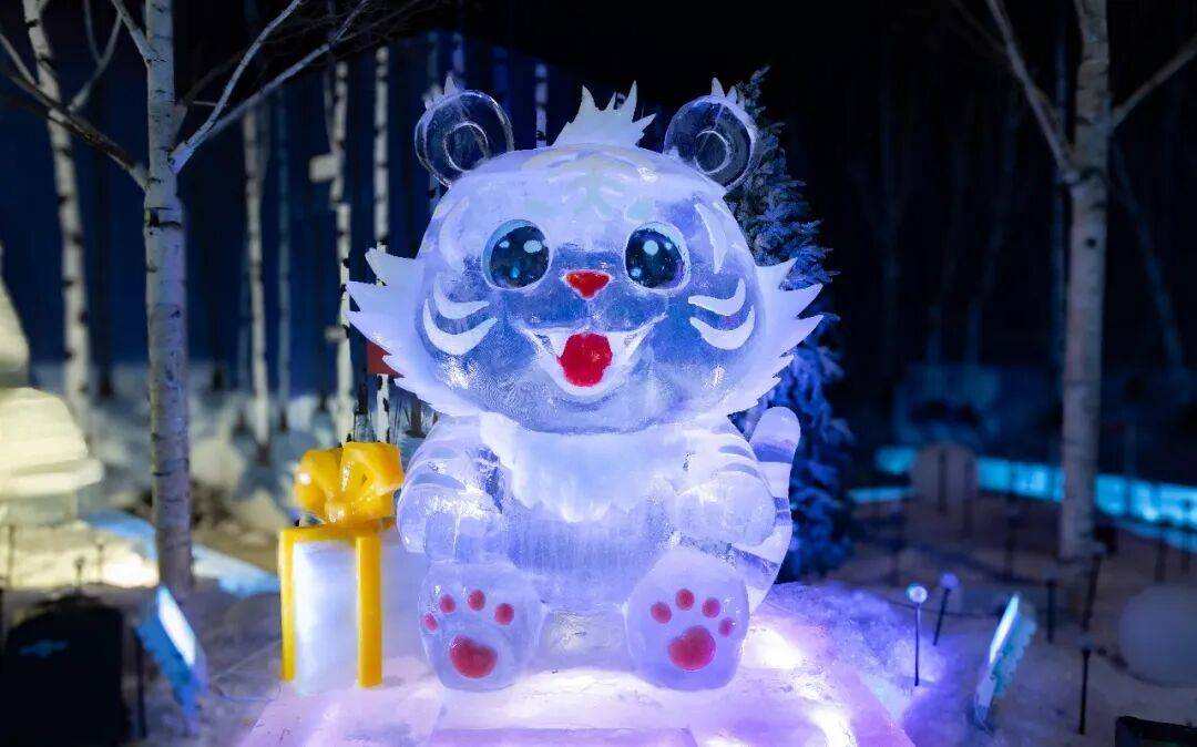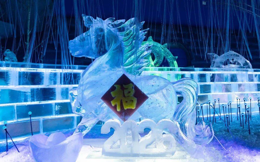 ‘행운의 띠’ 얼음 조각 경관물은 12지신의 고전적인 이미지를 담아내여 각기 다른 형태로 정교하게 배치되여 각자의 매력을 선보이고 있다. 12지신 얼음 조각은 송화강의 천연 얼음을 재료로 정성껏 조각하여 만들어졌으며 생동감 넘치는 모습으로 동양의 신비로움을 완벽히 보여주고 있다.