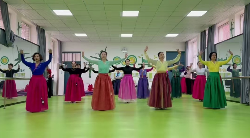 이어진 수업에서 지도교사는 조선족무용 기본동작 시범을 보였고 학생들은 <금강산 처녀> 노래에 맞춰 춤련습에 매진했다.