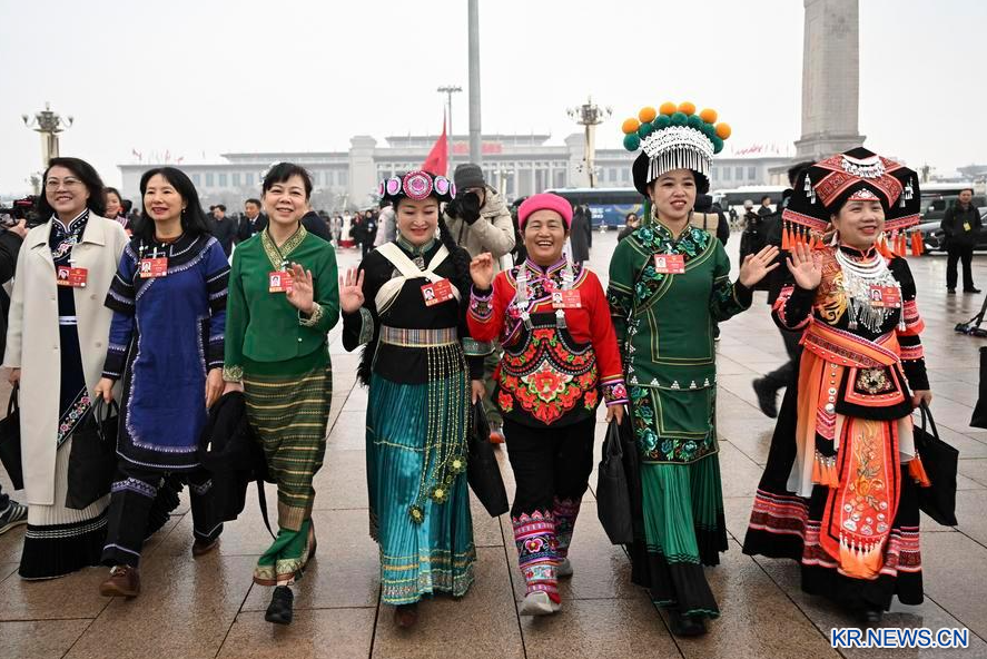 지난 5일 제14기 전국인민대표대회(전인대) 제4차 회의가 북경 인민대회당에서 개막했다. 이날 회의장으로 향하는 소수민족 대표들. (사진/신화통신)