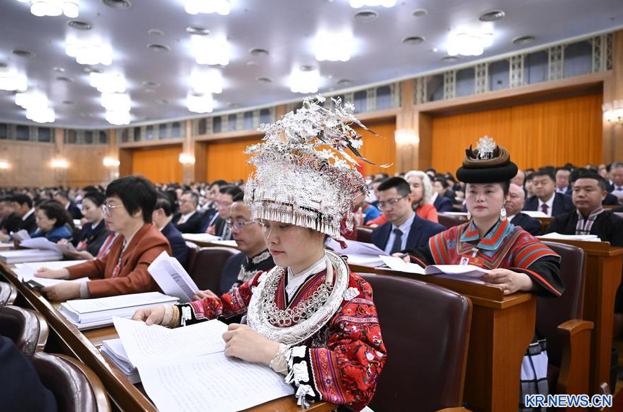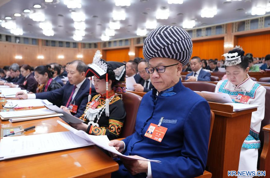 5일 북경 인민대회당에서 열린 제14기 전인대 제4차 회의 개막회에 참석한 소수민족 대표들. (사진/신화통신)