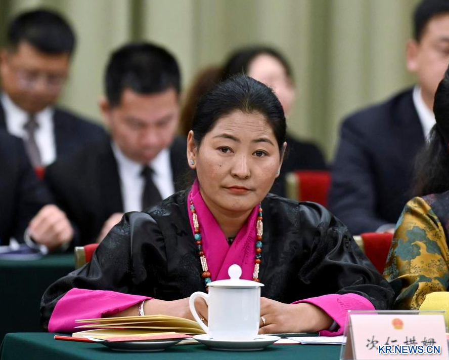 6일 서장(西藏)대표단 회의에 참석한 장(藏)족 전인대 대표 츠런춰무(次仁措姆). (사진/신화통신)