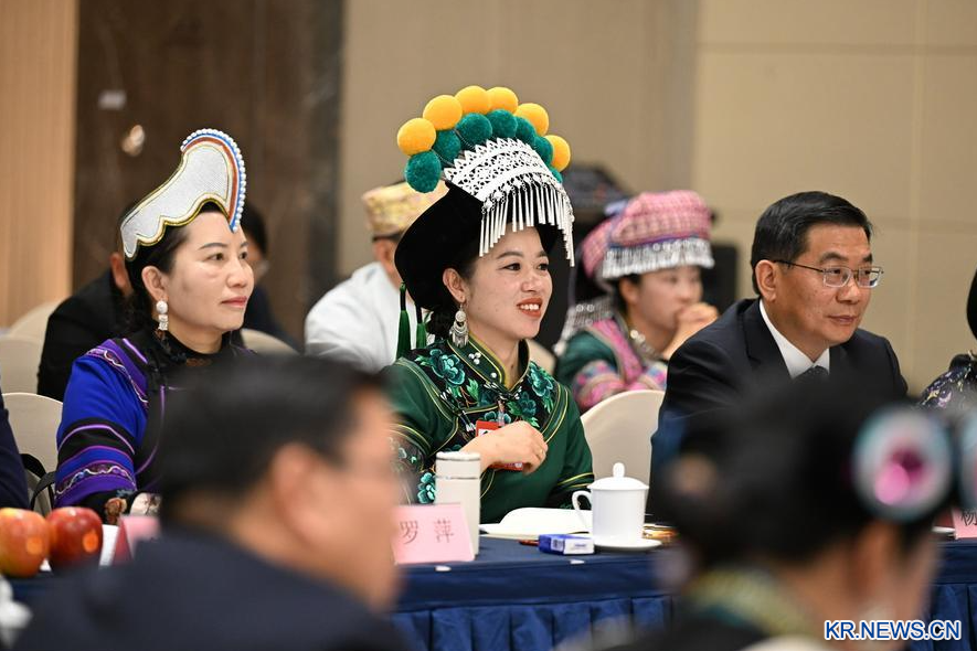 이(彝)족 전인대 대표 김서서(金瑞瑞∙가운데)가 7일 운남(雲南)대표단 회의에 참석했다. (사진/신화통신)