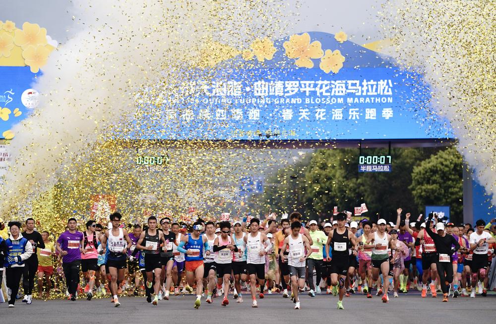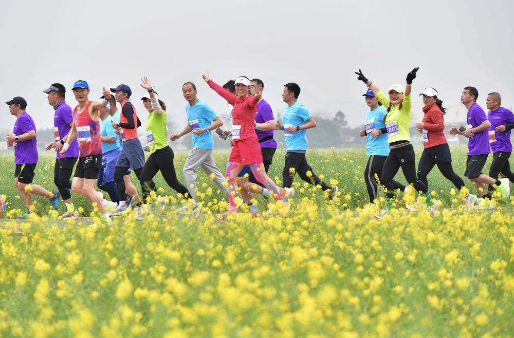 마라톤 참가 선수들이 15일 꽃길 사이를 달리고 있다. 이날 '2026 곡정(曲靖) 라평(羅平) 화하이(花海)마라톤'이 운남성 곡정시 라평현에서 개막했다.