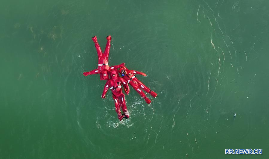 1월 17일 란산공원에서 물에 뜨도록 설계된 슈트를 입고 체험을 하는 시민들을 드론 사진에 담았다.