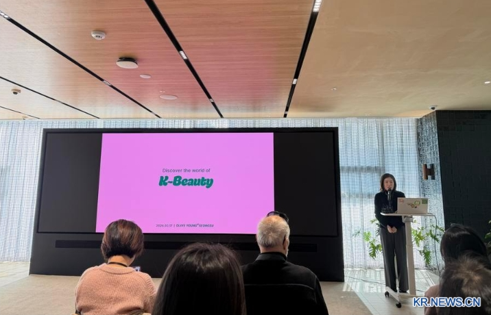 17일 CJ 그룹 산하 뷰티 리테일 브랜드 올리브영 담당자가 기자들에게 한국 뷰티 산업 현황을 소개하고 있다.